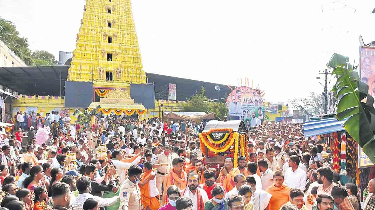 స్వామి, అమ్మవార్ల ఉత్సవ విగ్రహాలను అర్చకులు ఆలయం నుంచి పోలీసుబొమ్మ, రాతిగీరలు, ఆలయ పరిసరాల్లో ఊరేగింపుగా నిర్వహిస్తూ కల్యాణ వేదిక వద్దకు తీసుకొచ్చారు. మధ్యప్రదేశ్ ఉజ్జయిని పీఠాధిపతి సిద్ధలింగరాజ దేశికేంద్ర శివాచార్యుల పర్యవేక్షణలో కల్యాణోత్సవం జరిగింది. నడిపుడి మఠం భావనయ్యస్వామి, భువనేశ్వరస్వామి, ఆనందయ్య, జ్ఞానేశ్వర్శాస్త్రి, చంద్రశేఖర్స్వామి, భద్రయ్యస్వామి పురోహితులుగా, వ్యాఖ్యాతలుగా డాక్టర్ మహంతయ్య, నందుల మఠం శశిభూషణ సిద్ధాంతి స్వామీజీలు వ్యవహరించారు. ఉదయం 5గంటలకు ఆలయవర్గాలు రెండు క్వింటాళ్ల బియ్యాన్ని అన్నం వండి రాశిగా తయారుచేసి దృష్టికుంభం కార్యక్రమాన్ని నిర్వహించారు.