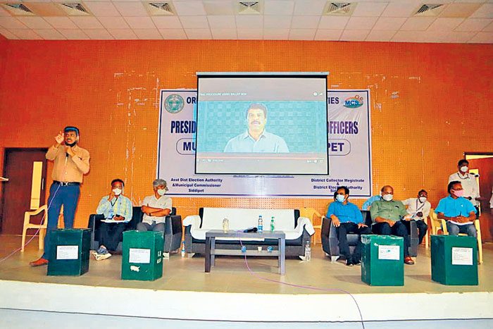 కేంద్రాల్లో కేంద్ర, రాష్ట్ర నాయకుల ఫొటోలు, పెయింటింగ్లు ఉన్నట్లయితే కనిపించకుండా జాగ్రత్తలు తీసుకోవాలన్నారు. ఉదయం 7 నుంచి సాయంత్రం 5 గంటల వరకే పోలింగ్ ఉంటుందని, ముందుగా వంద శాతం పూర్తయినా ఎన్నికల కమిషన్ తెలిపిన సమయం వరకు అధికారులు ఉండాల్సి ఉంటుందన్నారు. బ్యాలెట్ బాక్సు సరిగ్గా ఉందో లేదో సీల్ పడుతుందా లేదా చెక్ చేసుకోవాలన్నారు. ఓటర్ల సంఖ్యకు అనుగుణంగా బ్యాలెట్ పత్రాలు ఉన్నాయా అని సరిచూసుకోవాలన్నారు. పోలింగ్ కేంద్రానికి 100 మీటర్ల పరిధిలో వాహనాల పార్కింగ్కు వీల్లేదన్నారు. కేంద్రాల్లో పీవో, ఏపీవోలు, ఏజెంట్లు, ఎంట్రీ, ఎగ్జిట్, మూత్రశాలలు గుర్తు పట్టేలా పేరుతో కూడిన స్టిక్కర్లు ఉండేట్లు చూడాలన్నారు. పోలింగ్ బూత్లో ఒక ఓటరు మాత్రమే ఉండాలన్నారు. ఓటరు 18 రకాల కార్డుల్లో ఏదేని ఫొటో గుర్తింపు కార్డును చూపితే ఓటు వేసేందుకు అనుమతించాలన్నారు. మైక్రో అబ్జర్వర్, సీసీ కెమెరాలు, వెబ్ క్యాస్టింగ్ ప్రతి పోలింగ్ కేంద్రంలో ఉంటాయన్నారు. అధికారులకు ఐడీ కార్డు తప్పనిసరి ఉండాలన్నారు. కొవిడ్ నిబంధనలకు అనుగుణంగా ఎన్నికలు జరపాలని సూచించారు.