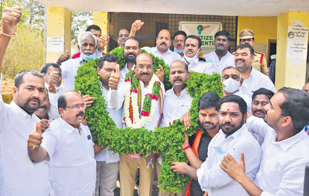 ఉమ్మడి మెదక్ స్థానిక సంస్థల ఎమ్మెల్సీ ఎన్నికల్లో టీఆర్ఎస్ అభ్యర్థి యాదవరెడ్డి ఘన విజయం సాధించడంతో టీఆర్ఎస్ నాయకులు, కార్యకర్తలు పెద్దఎత్తున కౌంటింగ్ కేంద్రానికి తరలివచ్చి శుభాకాంక్షలు తెలిపారు. ఈ సందర్భంగా యాదవరెడ్డిని గజమాలతో సన్మానించారు. టీఆర్ఎస్ శ్రేణులు జిల్లా కేంద్రమైన మెదక్ పట్టణంలో సంబురాలు చేసుకున్నారు. మెదక్ ఎమ్మెల్యే క్యాంపు కార్యాలయం ఆవరణలో పటాకులు కాల్చారు. ఎమ్మెల్యే క్యాంపు కార్యాలయానికి పెద్దఎత్తున తరలివచ్చిన టీఆర్ఎస్ శ్రేణులు, కార్యకర్తలు, నాయకులు ఎమ్మెల్సీ యాదవరెడ్డికి శుభాకాంక్షలు తెలిపారు.