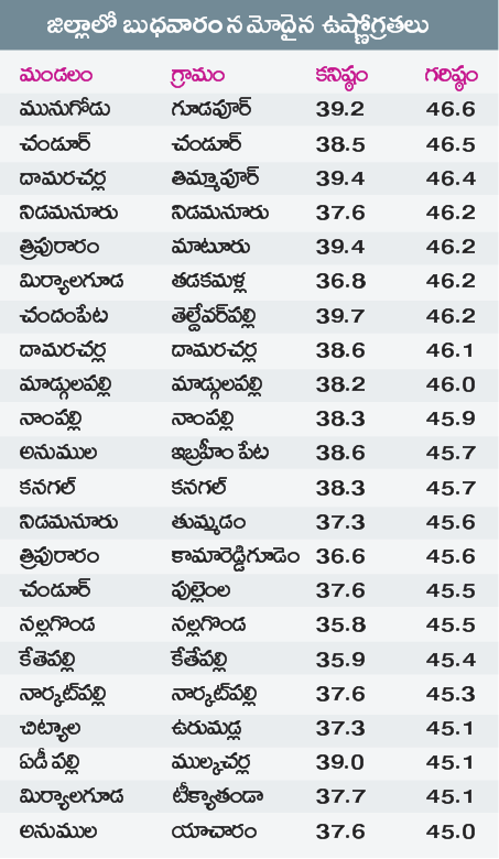 నల్లగొండ, మే 1: ఎండలు దంచికొడుతున్నాయి. రోజురోజుకు ఉష్ణోగ్రతలు రికార్డు స్థాయికి చేరుకుంటున్నాయి. జిల్లాలో బుధవారం అత్యధికంగా మునుగోడు మండలం గూడపూర్లో 46.6 డిగ్రీల గరిష్ఠ ఉష్ణోగ్రతలు నమోదయ్యాయి. ఈ సీజన్లో ఇదే ఎక్కువ ఉష్ణోగ్రత. ఎండలు ప్రజలను భయాందోళనకు గురి చేస్తున్నాయి. ఉదయం 8గంటల నుంచే మొదలవుతున్న ఎండ వేడిమి మధ్యాహ్నం వరకు నిప్పుల కుంపటిగా మారుతున్నది. పది గంటలు దాటిందంటే ఇండ్ల నుంచి బయటకు రావాలంటే జనం జంకుతున్నారు.
