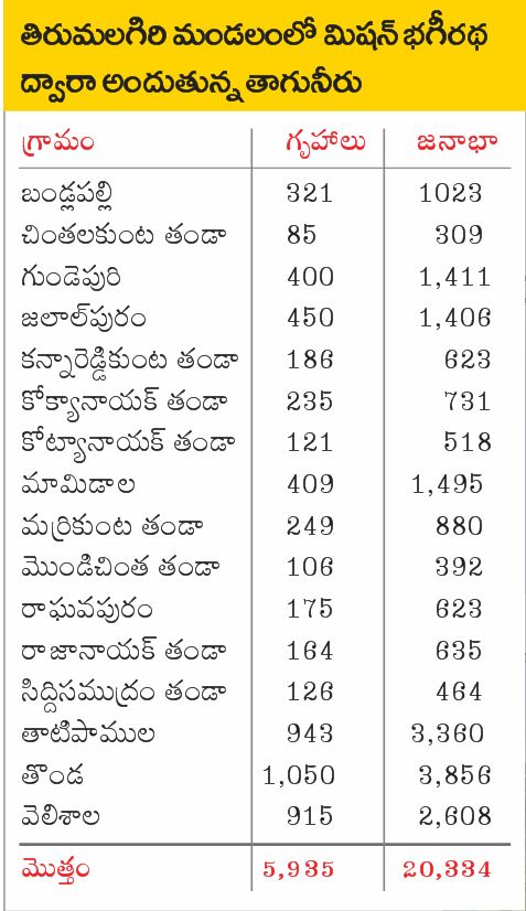 ఉమ్మడి నల్లగొండ జిల్లాలో ప్రధానమైన ఫ్లోరైడ్ సమస్యను రూపుమాపాలన్న ఆలోచనతోనే ఇంటింటికీ సురక్షితమైన తాగునీటిని అందించేందుకు ముఖ్యమంత్రి కేసీఆర్ మిషన్ భగీరథ పథకానికి శ్రీకారం చుట్టారు. లక్ష్యం మేరకు వాటర్ ట్రీట్మెంట్ ప్లాంట్లు, ట్యాంకులు, పైపులైన్లు పెద్ద ఎత్తున నిర్మించి గడపగడపకూ మంచినీటిని అందిస్తున్నారు. సూర్యాపేట జిల్లా వ్యాప్తంగా మిషన్ భగీరథ కోసం కృష్ణా నది నీటిని వినియోగిస్తుండగా తిరుమలగిరి మండలానికి మాత్రం కాళేశ్వరం జలాలు ఇస్తున్నారు. సూర్యాపేట జిల్లాలో కాళేశ్వరం ప్రాజెక్టు ద్వారా మిషన్ భగరథ నీరు అందుతున్న తొలి మండలం ఇదే. గతంలో జనగాం జిల్లాలోని సింగరాజుపల్లి నుంచి వచ్చే పైప్లైన్ ద్వారా నీటిని అందించగా ఈ ఏడాది మార్చి నుంచి మల్లన్నసాగర్ రిజర్వాయర్ మంగోల్ నుంచి సరఫరా చేస్తున్నారు. సమైక్య పాలనలో తాగునీటి కోసం ఇక్కడి ప్రజలు ఎన్నో తంటాలు పడ్డారు. బిక్కేరు వాగులో చెలిమలు తీసి, వ్యవసాయ బావుల వద్దకు క్యూ కట్టి నీరు తెచ్చుకునేది. ఇప్పుడు ఇంటికే కాళేశ్వరం నీళ్లు వస్తున్నాయి. మండలంలోని సుమారు 12 వేల ఇండ్లలోని 38,804 మంది ప్రజలు స్వచ్ఛమైన నీటిని తాగుతున్నారు.