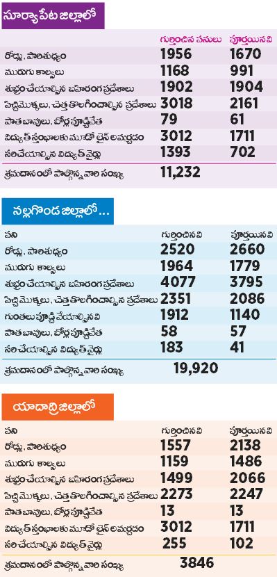 పల్లె ప్రగతిలో చేయాల్సిన పనులను సూర్యాపేట జిల్లాలో ముందే గుర్తించగా ఇప్పటికే 60 నుంచి 80 శాతం పనులు పూర్తయ్యాయి. ప్రజాప్రతినిధులతోపాటు జిల్లా, మండల స్థాయి అధికారులు, ప్రజలు పాల్గొంటుండడంతో పనులు ముమ్మరంగా సాగుతున్నాయి. మరో వారం రోజుల కార్యక్రమంలో గుర్తించిన పనులన్నీ పూర్తవుతాయి.