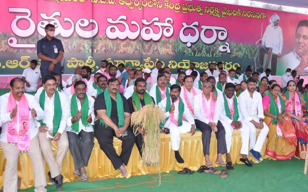 రైతులపై చీమలు పారినా తెలంగాణ సర్కారు సహించబోదని ముఖ్యమంత్రి కేసీఆర్ రైతు పక్షపాతి మాత్రమే కాదని రైతుల పక్షం అన్నది కేంద్రం గుర్తించాలన్నారు. ముఖ్యమంత్రి కేసీఆర్ పిడికిలి బిగిస్తే ఢిల్లీ సర్కార్ అతలాకుతలం అవుతుందని ఆయన అన్నారు. సీఎం కేసీఆర్ నిర్ణయాలతో రాష్ట్రం ఇప్పుడిప్పుడే సస్యశ్యామలం అవుతున్నదని, అటువంటి తరుణంలో కేంద్రం ధాన్యాన్ని కొనుగోలు చేయమంటూ చేతులు ఎత్తేసి రైతుల నోట్లో మట్టి కొడుతున్నదని దుయ్యబట్టారు. తెలంగాణ రైతాంగం బాగుపడడం ఇష్టం లేకనే రైతు వ్యతిరేక విధానాలను కేంద్రం ముందుకు తెస్తుందని విమర్శించారు. ధాన్యం కొనుగోళ్ల విషయంలో మోదీ సర్కార్ అవలంబిస్తున్న ద్వంద విధానాన్ని ప్రజాక్షేత్రంలో ఎండగడతామని పేర్కొన్నారు. రైతుల ఆగ్రహంతో మోదీ సర్కారు మాడిమసై పోతుందని, కేంద్రం పద్ధతి మార్చుకునేంత వరకు పోరాటం కొనసాగుతుందని మంత్రి జగదీశ్రెడ్డి హెచ్చరించారు. ధర్నాలో టీఆర్ఎస్ రాష్ట్ర కార్యదర్శి వై.వెంకటేశ్వర్లు, ఉమ్మడి జిల్లా డీసీఎంఎస్ చైర్మన్ ఒట్టె జానయ్యయాదవ్, జిల్లా గ్రంథాలయ సంస్థ చైర్మన్ నిమ్మల శ్రీనివాస్గౌడ్, మున్సిపల్, మార్కెట్ కమిటీ చైర్పర్సన్లు అన్నపూర్ణమ్మ, ఉప్పల లలితాఆనంద్తో పాటు పెద్ద ఎత్తున రైతులు, టీఆర్ఎస్ శ్రేణులు పాల్గొన్నారు.