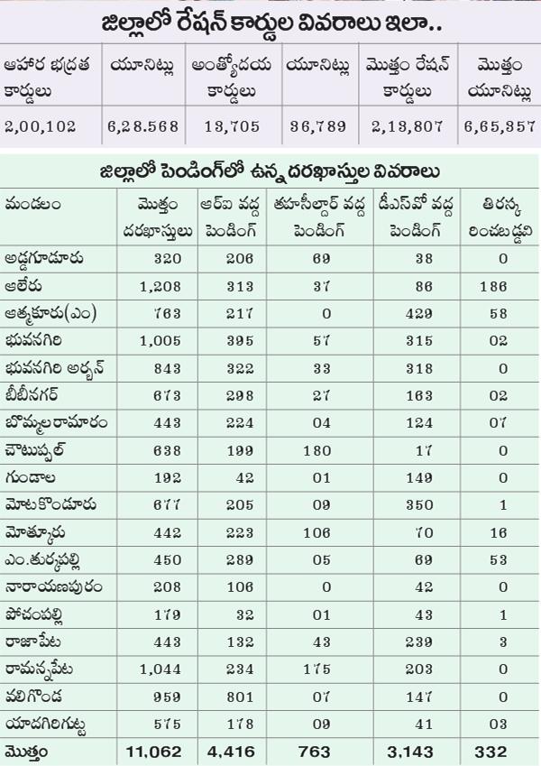 జిల్లా ఏర్పాటు నుంచి నేటి వరకు కొత్త రేషన్ కార్డుల కోసం 11,062 దరఖాస్తులు ప్రభుత్వానికి వచ్చాయి. ఉమ్మడి కుటుంబాల నుంచి విడిపోయి వేరుగా ఉంటున్నవారు.. కొత్తగా పెండ్లి చేసుకున్నవారు.. రేషన్ కార్డుల కోసం దరఖాస్తు చేసుకున్నారు. హైదరాబాద్, ముంబయి తదితర ప్రాంతాలకు వలసవెళ్లి సొంతూళ్లకు వచ్చిన వారు సైతం గత రెండేండ్లలో పెద్ద ఎత్తున కార్డులకు దరఖాస్తు చేసుకున్నారు. కొత్త జిల్లా ఏర్పాటు సందర్భంగా జారీ చేసిన 2,408 కార్డులు మినహా.. గడచిన రెండేండ్లలో వివిధ కారణాలతో కార్డుల జారీ ప్రక్రియను ప్రభుత్వం చేపట్టలేదు. ప్రస్తుతం ఆర్ఐ లాగిన్లో 4,416 దరఖాస్తులు, తహసీల్దార్ లాగిన్లో 763 దరఖాస్తులు, జిల్లా పౌరసరఫరాల శాఖ అధికారి లాగిన్లో 3,143 దరఖాస్తులు పెండింగ్లో ఉన్నాయి. వీటికి 15 రోజుల్లోనే క్లియరెన్స్ లభించి రేషన్ కార్డులు మంజూరు కానున్నాయి. 15 రోజుల్లోనే ఈ ప్రక్రియ పూర్తికానుండడంతో లాక్డౌన్లో పేదల ఆకలి తీర్చేందుకు కేంద్ర, రాష్ట్ర ప్రభుత్వాలు అందిస్తున్న ఉచిత బియ్యం కొత్త రేషన్ కార్డుదారులకు సైతం అందనున్నది.