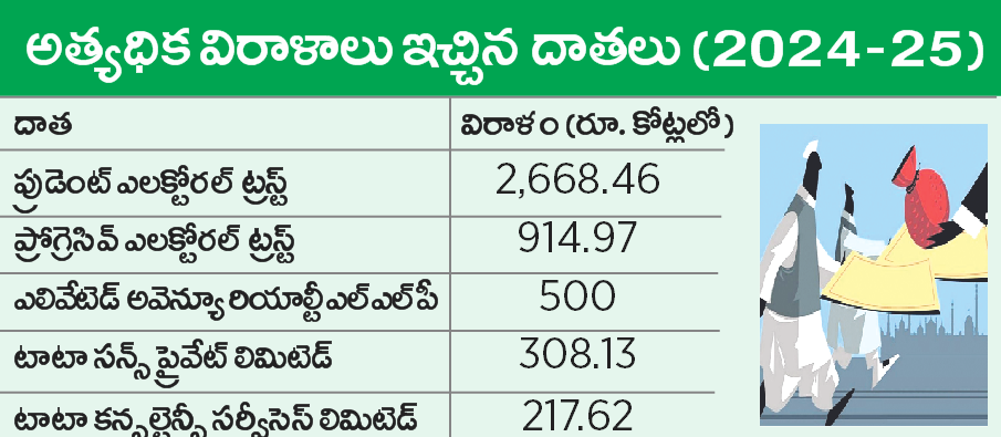 అప్పటి నుంచి కేంద్ర ప్రభుత్వ కాంట్రాక్టులు దక్కించుకున్న కార్పొరేట్ స ంస్థలు రాజకీయ విరాళాలు ఇవ్వడానికి ఎలక్టోరల్ ట్రస్ట్ల బాట పట్టాయి. ఫలితంగా అత్యధిక రాజకీయ విరాళ దాతలుగా ఎలక్టోరల్ ట్రస్టులు నిలిచా యి. వీటిల్లో ప్రుడెంట్ ఎలక్టోరల్ ట్రస్ట్ అగ్రస్థానంలో ఉంది. ఇది 15 రాజకీయ పార్టీలకు 2024-25 ఆర్థిక సంవత్సరంలో రూ. 2,668.46 కోట్లను విరాళాలుగా ఇచ్చింది.