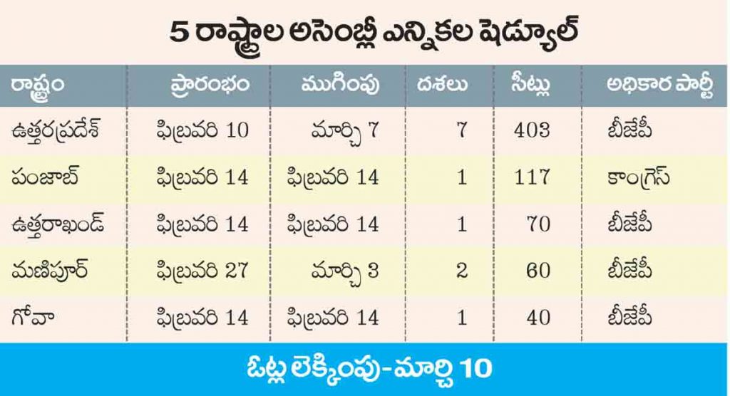 ఎన్నికలు జరుగనున్న ఐదు రాష్ర్టాల్లో పంజాబ్ మినహా నాలుచోట్ల బీజేపీనే అధికారంలో ఉన్నది. పంజాబ్ కాంగ్రెస్ చేతిలో ఉన్నది. ఈ ఎన్నికల్లో నాలుగు రాష్ర్టాల్లో అధికారం నిలుపుకోవటంతోపాటు పంజాబ్లోనూ పాగా వేయాలని బీజేపీ ప్రయత్నిస్తున్నది. ఉత్తరప్రదేశ్లో బీజేపీని గద్దెదింపటం ద్వారా 2024 పార్లమెంటు ఎన్నికలకు విజయోత్సాహంతో సిద్ధం కావాలని ప్రతిపక్షాలు పోరాడుతున్నాయి.