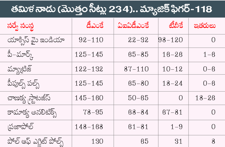 తమిళనాడులో అధికార డీఎంకే వరుసగా రెండవ సారి అధికారాన్ని చేపట్టనున్నట్లు అనేక సర్వే సంస్థలు అంచనా వేశాయి. బీజేపీతో చేతులు కలిపి బరిలోకి దిగిన అన్నాడీఎంకేకు మరోసారి ఓటమి తప్పదని సర్వేలు పేర్కొన్నారు. రాజకీయ అరంగేట్రం చేసి తొలిసారి ఎన్నికల పోరులో పాల్గొన్న సినీనటుడు విజయ్ సారథ్యంలోని టీవీకేకి రెండంకెల సీట్లు దక్కే అవకాశం ఉన్నట్లు సర్వేలు అంచనా వేశాయి.