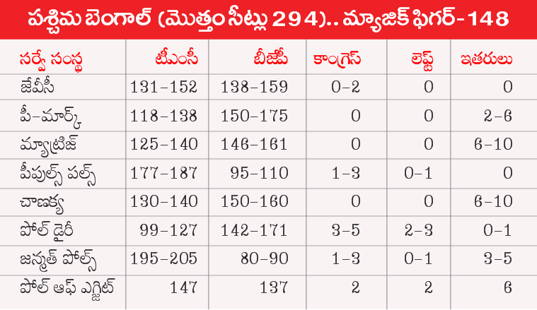 పశ్చిమ బెంగాల్లో అధికార టీఎంసీ, బీజేపీ మధ్య హోరాహోరీ పోరు ఏర్పడినట్లు ఎగ్జిట్ పోల్స్ ఫలితాలు సూచిస్తున్నాయి. మెజారిటీ ఎగ్జిట్ పోల్స్ సర్వేలు బీజేపీకే విజయావకాశాలు అధికంగా ఉన్నట్లు అంచనా వేయగా పీపుల్స్ పల్స్, పోల్ ఆఫ్ ఎగ్జిట్ పోల్స్ సర్వేలు మాత్రం మమతా బెనర్జీ నేతృత్వంలోని టీఎంసీ మరోసారి అధికార పీఠాన్ని దక్కించుకోనున్నట్లు అంచనా వేశాయి.