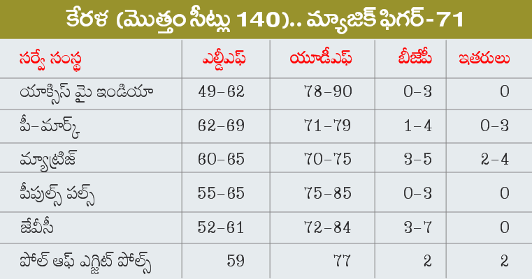 కేరళలో సీపీఎం సారథ్యంలోని ఎల్డీఎఫ్ అధికారాన్ని కోల్పోయి కాంగ్రెస్ నేతృత్వంలోని యూడీఎఫ్ అధికారంలోకి రానున్నట్లు ఎగ్జిట్ పోల్స్ అంచనా వేశాయి. అస్సాంలో బీజేపీ అధికారాన్ని నిలబెట్టుకుంటుండగా పుదుచ్చేరిలో సైతం బీజేపీ సారథ్యంలోని కూటమే విజయం సాధించనున్నట్లు ఎగ్జిట్ పోల్స్ అంచనాలు చెబుతున్నాయి.