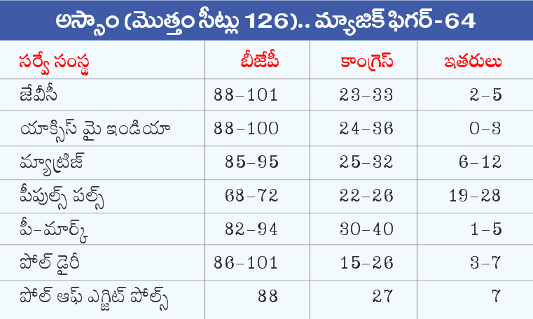 అస్సాంలో బీజేపీ హ్యాట్రిక్ విజయం సాధించనున్నట్లు సర్వే సంస్థలు అంచనా వేశాయి. బీజేపీ కూటమికి 88-100 స్థానాలు, కాంగ్రెస్ కూటమికి 24-36 స్థానాలు దక్కవచ్చని యాక్సిస్ మై ఇండియా అంచనా వేసింది. పీపుల్స్ పల్స్ సర్వే ప్రకారం బీజేపీ కూటమికి 68-72, కాంగ్రెస్ కూటమికి 22-26 సీట్లు దక్కవచ్చని అంచనా.