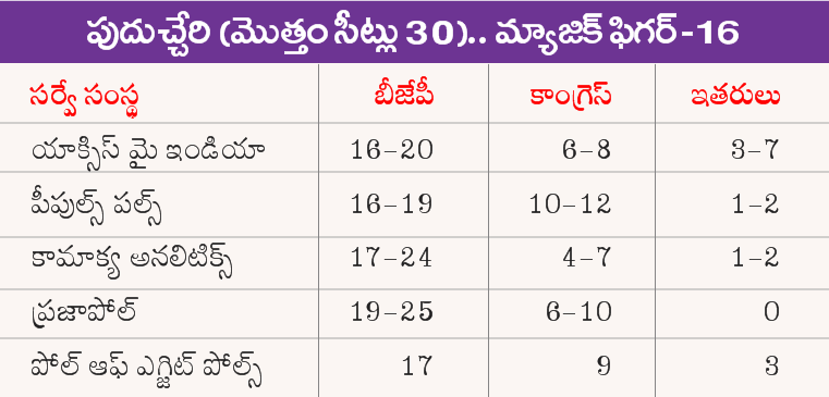 పుదచ్చేరిలో బీజేపీ కూటమికే విజయావకాశాలు ఉన్నట్లు సర్వేలు అంచనా వేశాయి. ఎగ్జిట్ పోల్స్ అంచనాలు ఎలా ఉన్నప్పటికీ మే 4న వెలువడే తుది ఫలితాలు పార్టీలు, అభ్యర్థుల తలరాతను నిర్ణయించనున్నాయి.