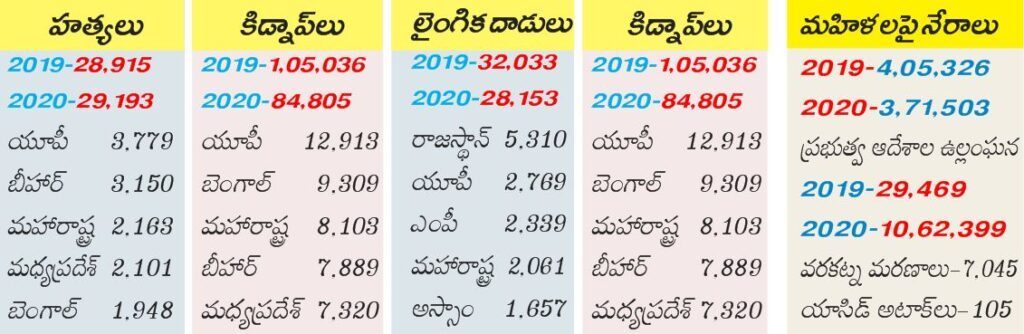 న్యూఢిల్లీ, సెప్టెంబర్ 15: దేశంలో సగటున ప్రతీ గంటకు మూడు రేప్లు, మూడు హత్యలు నమోదవుతున్నాయి. 2020లో దేశవ్యాప్తంగా 28,153 మందిపై లైంగిక దాడి జరిగింది. వీరిలో 2,655 మంది పద్దెనిమిదేండ్ల లోపువారు. జాతీయ నేర గణాంక సంస్థ(ఎన్సీఆర్బీ) ఈ వివరాలను వెల్లడించింది. 2020లో జరిగిన నేరాలపై నివేదికను బుధవారం విడుదల చేసింది. రోజూ 77 రేప్లు, 80 మర్డర్లు జరుగుతున్నాయని పేర్కొన్నది. 2020లో 29,193 హత్యలు నమోదైనట్టు తెలిపింది. హత్య కేసుల్లో ఉత్తరప్రదేశ్ మొదటి స్థానంలో ఉంది. అంతకుముందు ఏడాదితో పోలిస్తే 2020లో హత్యలు 1% పెరిగాయి. 2019లో 28,915 హత్య కేసులు నమోదయ్యాయి. 2020లో 84,805 మంది కిడ్నాప్ అవగా.. వీరిలో పిల్లలు 56,591 మంది. మొత్తంగా మహిళలపై వివిధ నేరాలకు సంబంధించి దేశవ్యాప్తంగా 3,71,503 కేసులు నమోదయ్యాయి. ఇది అంతకుముందు ఏడాది 4,05,326గా ఉంది. 2019తో పోల్చితే 2020లో దేశంలో దొంగతనం, దోపిడీ, మహిళలపై దాడులు తగ్గాయి. అయితే ప్రభుత్వం ఆదేశాల ఉల్లంఘన భారీగా పెరిగింది. ఇందులో కొవిడ్ నిబంధనల ఉల్లంఘనదే సింహభాగం.