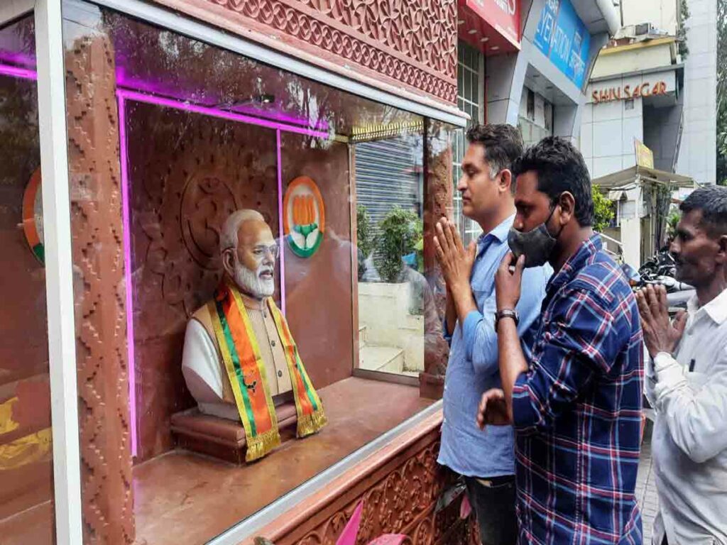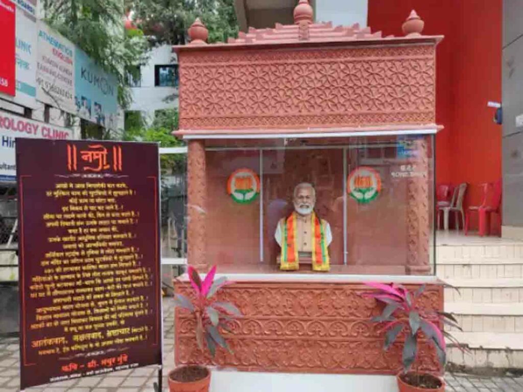 ముంబై: బీజేపీ కార్యకర్త ఒకరు ప్రధాని నరేంద్ర మోదీ గుడి కట్టారు. దీని కోసం రూ.1.6 లక్షలు ఖర్చు చేశారు. మహారాష్ట్రలోని పూణేకు చెందిన బీజేపీ కార్యకర్త మయూర్ ముండే, తనకు చెందిన అనుద్ ప్రాంతంలోని రోడ్డు పక్కన స్థలంలో మోదీకి చిన్న గుడి కట్టారు. జైపూర్ నుంచి ఎర్రని పాల రాయిని తెప్పించి నిర్మాణానికి వినియోగించారు. తెల్ల పాలరాయితో చేసిన మోదీ విగ్రహాన్ని అందులో ఏర్పాటు చేశారు. భద్రతగా ముందు వైపు గట్టి అద్దాన్ని ఫిక్స్ చేశారు. ఆ గుడి ముందు మోదీకి అంకితమిస్తూ ఒక పద్యంతో కూడిన బోర్డును కూడా ఏర్పాటు చేశారు. రూ.1.6 లక్షల వ్యయంతో ఆరు నెలల్లో మోదీ గుడి నిర్మాణాన్ని పూర్తి చేశారు. 75వ స్వాతంత్ర్య దినోత్సవం సందర్భంగా ఆదివారం దీనిని ప్రారంభించారు.