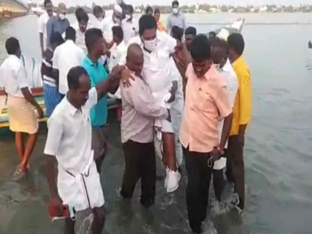చెన్నై: కాళ్లకు ధరించిన బూట్లు నీటిలో తడుస్తాయని పడవ దిగేందుకు వెనుకాడిన మంత్రిని మత్స్యకారులు తమ చేతులపై మోశారు. తమిళనాడులోని తిరువల్లూరు జిల్లాలో ఈ ఘటన జరిగింది. అధికార డీఎంకే పార్టీకి చెందిన మత్స్యశాఖ మంత్రి అనితా రాధాకృష్ణన్ సముద్రపు కోతను పరిశీలించేందుకు పాలవర్కడులో పర్యటించారు. స్థానికులతో మాట్లాడిన అనంతరం పడవపై ఆయన ప్రయాణించారు. బోటు తీరానికి చేరగా మంత్రి దిగేందుకు మత్స్యకారులు ఒక కూర్చివేశారు. అయితే పడవ ఒడ్డుకు కాస్త దూరంలో నిలిచింది. దీంతో తన కాలి బూట్లు నీటిలో తడుస్తాయని భావించిన అనితా రాధాకృష్ణన్ పడవ దిగేందుకు వెనుకాడారు. మంత్రి భావాన్ని గ్రహించిన మత్స్యకారులు ఆయనను తమ చేతులపై మోసి ఒడ్డుకు చేర్చారు. కాగా, ఈ వీడియో సామాజిక మాధ్యమాల్లో వైరల్ అయ్యింది. మంత్రి వీఐపీ కల్చర్పై పలువురు విమర్శలు చేశారు.