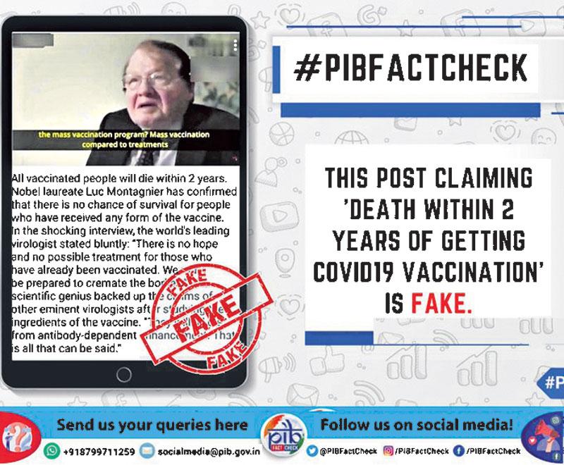 కరోనా వ్యాక్సిన్ వేసుకుంటే రెండేండ్లలో చనిపోతారనేది పూర్తిగా అవాస్తవమని కేంద్రప్రభుత్వ విభాగమైన పబ్లిక్ ఇన్ఫర్మేషన్ బ్యూరో (పీఐబీ) తెలిపింది. లుక్ మాంటగ్నైర్ చెప్పినట్లుగా సోషల్మీడియాలో ప్రచారంలో ఉన్న పోస్టు నకిలీదని పేర్కొంది. ఇలాంటి తప్పుడు ప్రచారాన్ని షేర్ చేయొద్దని ప్రజలకు సూచించింది. కరోనాను కట్టడి చేయడంలో వ్యాక్సిన్ సమర్థంగా పనిచేస్తుందని, యాంటీ బాడీలు వృద్ధి చెంది అవి వైరస్ల నుంచి పూర్తిస్థాయిలో రక్షణ కల్పిస్తాయని స్పష్టం చేసింది. ఇక, కెనడాకు చెందిన ‘లైఫ్సైట్న్యూస్’ గతంలో ఎన్నో అసత్య వార్తలను ప్రచురించి అబాసుపాలైంది. ఆ సైట్లో ప్రచురించే కొవిడ్-19 వార్తలన్నీ అసత్యాలే.