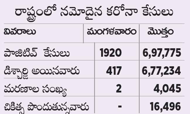 హైదరాబాద్, జనవరి 11 (నమస్తే తెలంగాణ): రాష్ట్రంలో కరోనా కేసులు స్వల్పంగా పెరిగాయి. మంగళవారం 1,920 కేసులు వెలుగు చూశాయి. పాజిటివిటీ 2.30 శాతంగా నమోదైంది. మరోవైపు 417 మంది కోలుకొని డిశ్చార్జి అయ్యారు. యాక్టివ్ కేసుల సంఖ్య 16 వేలు దాటింది. అత్యధికంగా జీహెచ్ఎంసీలో 1,015, మేడ్చల్ మల్కాజిగిరిలో 209, రంగారెడ్డిలో 159, సంగారెడ్డి, హనుమకొండలో 55 కేసులు వెలుగు చూశాయి.