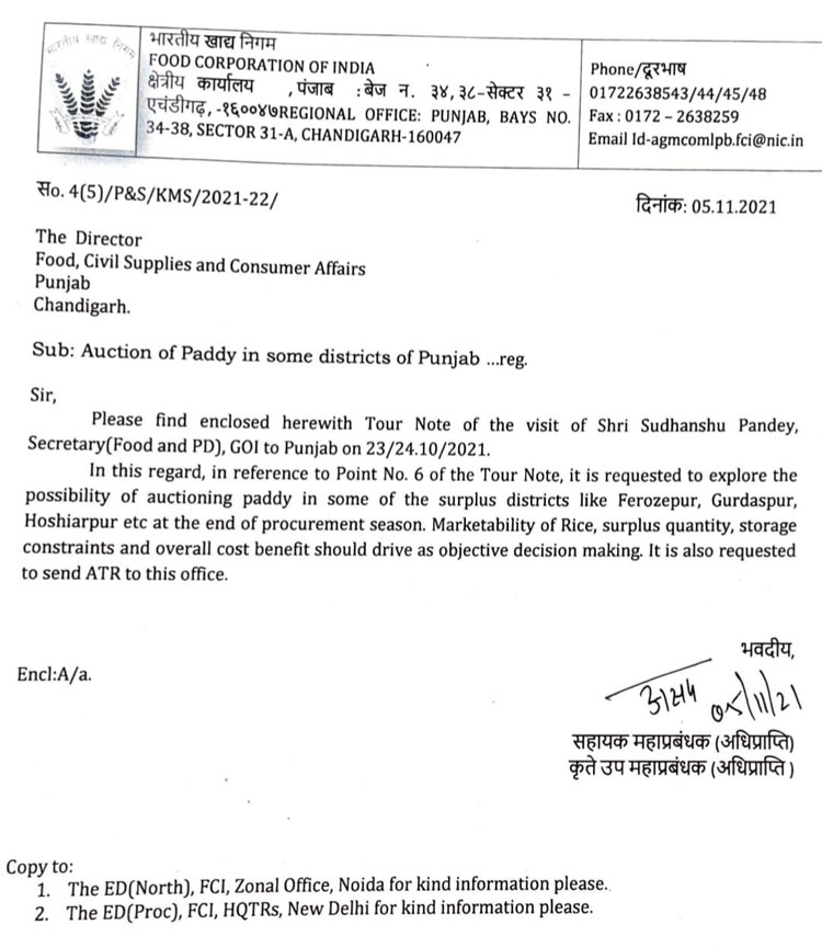 పంజాబ్లో కొన్ని చోట్ల ధాన్యం నిల్వలు ఎక్కువగా ఉన్నందున నేరుగా వేలం వేయాలని కేంద్ర ఆహార మంత్రిత్వశాఖ అభిప్రాయపడింది. ఇటీవల ఆ రాష్ట్రంలో పర్యటించిన కేంద్ర ఆహార మంత్రిత్వశాఖ కార్యదర్శి సుధాన్షు పాండే స్వయంగా వేలంపై సూచనలు చేశారు. వేలంలో కొనుగోలు కాకుంటే సీఎంఆర్ తీసుకుంటామని భరోసా ఇచ్చారు.
