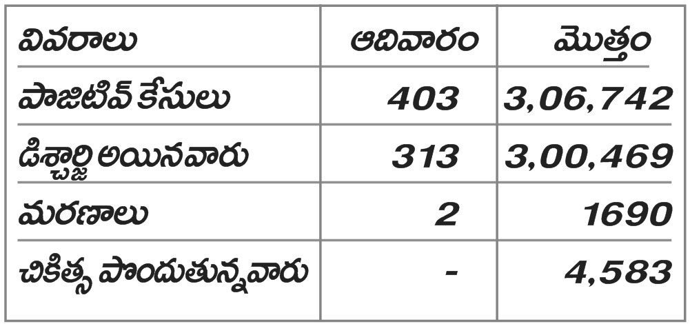 హైదరాబాద్, మార్చి 29 (నమస్తే తెలంగాణ): రాష్ట్రంలో కరోనా కేసుల సంఖ్య క్రమంగా పెరుగుతున్నది. ఆదివారం 33,930 నమూనాలను పరీక్షించగా, 403 మందికి వైరస్ పాజిటివ్గా తేలినట్టు సోమవారం విడుదలచేసిన బులెటిన్లో వైద్యారోగ్యశాఖ వివరించింది. గ్రేటర్ హైదరాబాద్తోపాటు జిల్లాల్లోనూ వైరస్ వ్యాప్తిపెరిగింది. అత్యధికంగా జీహెచ్ఎంసీలో 146, మేడ్చల్ మల్కాజిగిరి జిల్లాలో 40, రంగారెడ్డిలో 34, సంగారెడ్డిలో 24, మహబూబ్నగర్, యాదాద్రి భువనగిరిలో 11 చొప్పున, కరీంనగర్, నిజామాబాద్లో 10 చొప్పున, వరంగల్ అర్బన్, జగిత్యాలో 9 చొప్పున కేసులు వెలుగుచూశాయి. ఆంధ్రప్రదేశ్లో కరోనా కేసులు రోజురోజకు పెరుగుతున్నాయి. ఆదివారం 31,325 వైరస్ నిర్ధారణ పరీక్షలుచేయగా, 997 మందికి పాజిటివ్గా తేలింది. అత్యధికంగా చిత్తూరులో 181 కేసులు నమోదయ్యాయి.
