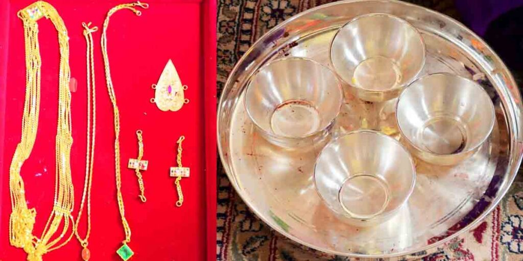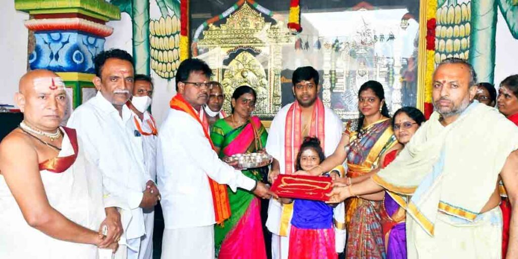 శ్రీశైలం : భ్రమరాంబ మల్లికార్జున స్వామిఅమ్మవార్ల కల్యాణమూర్తులకు బంగారు ఆభరణాలు భక్తులు బహూకరించారు. ఆదివారం ఉదయం నెల్లూరుకు చెందిన డీవీ సరస్వతి.. ఆమె వదిన బట్టారం సరస్వతి జ్ఞాపకార్థం బంగారు వెండి ఆభరణాలను ఈవో లవన్నకు అందజేశారు. ఆభరణాలలో స్వామివారికి 13 గ్రాముల బంగారు బాషికం, నవరత్నాలు పొదిగిన 89 గ్రాముల తొమ్మిది పొరల యఙ్ఞోపవీతం, అమ్మవారికి 21 గ్రాముల పగడపు బంగారు గొలుసు, కుమారస్వామికి ఎమ్రాల్డ్ గ్రీన్డాలర్తో 28 గ్రాముల బంగారు గొలుసు, స్వామిఅమ్మవార్లకు 17 గ్రాముల నవరత్న కంకణాలు, 300 గ్రాములు నాలుగు వెండి గిన్నెలు, 850 గ్రాముల వెండి పళ్లెం విరాళంగా ఇచ్చారు. దాతలకు ఉభయ దేవాలయాల్లో స్వామిఅమ్మవార్ల దర్శనాలతోపాటు అమ్మవారి ప్రాకార మండపంలో వేదాశీర్వచనాలు చేసి తీర్థప్రసాదాలు అందించారు. కానుకగా వచ్చిన ఆభరణాలను స్వామిఅమ్మవార్ల, సుబ్రహ్మణ్యస్వామివారి నిత్యకల్యాణోత్సవంలో వినియోగించాల్సిందిగా ఈవో ఆలయ సిబ్బందికి సూచించారు.