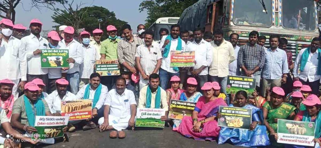 అనంతరం మోదీ సర్కారు దిష్టిబొమ్మను దహనం చేశారు. తల్లాడలోని రింగ్ సెంటర్లో రైతులు, టీఆర్ఎస్ కార్యకర్తలు నల్లచొక్కాలను ధరించి, తలపై ధాన్యం మూటలను పెట్టుకుని వినూత్నంగా నిరసన వ్యక్తం చేశారు. అనంతరం ఎడ్లబండ్ల ప్రదర్శన నిర్వహించారు. మోదీ దిష్టిబొమ్మకు శవయాత్ర నిర్వహించారు. ఉమ్మడి నల్లగొండ జిల్లావ్యాప్తంగా రైతు నిరసనలు కొనసాగాయి. ఆందోళనలకు టీఆర్ఎస్ నేతృత్వం వహించగా రైతాంగం స్వచ్ఛందంగా కదలివచ్చి నిరసన తెలిపింది. కొన్ని గ్రామాల్లో రైతులే స్వచ్ఛందంగా చావు డప్పు మోగిస్తూ, కేంద్ర ప్రభుత్వ దిష్టిబొమ్మలను ఊరేగించి దహనం చేశారు. మరికొన్ని చోట్ల కల్లాల వద్ద వరిగడ్డిని దిష్టిబొమ్మలా చేసి, అక్కడే తగులబెట్టి కేంద్రంపై తమ ఆగ్రహాన్ని వ్యక్తం చేశారు.