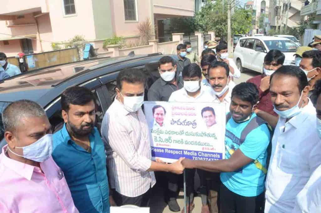 ఎల్బీనగర్, డిసెంబర్ 20: టీఆర్ఎస్ వర్కింగ్ ప్రెసిడెంట్, మంత్రి కే తారకరామారావుపై అభిమానంతో ఓ యువకుడు ఏకంగా 780 కిలోమీటర్లు నడిచాడు. ఏపీలోని శ్రీకాకుళం జిల్లా రాజాంకు చెందిన శేఖర్ తన ఊరు నుంచి హైదరాబాద్ వరకు కాలినడకన వచ్చాడు. గత నెల 30న బయలుదేరిన ఆ యువకుడు ఈ నెల 19న నగరానికి చేరుకొన్నాడు. అతడిని ఓ కార్యక్రమంలో కలిసిన కేటీఆర్.. ‘నాపై అభిమానంతో అంతదూరం నుంచి నడిచివచ్చావా?’ అని పలుకరించారు. రెండు రోజుల్లో ప్రగతిభవన్కు రావాలని చెప్పారు. దీంతో శేఖర్ ఆనందానికి అవధులు లేకుండా పోయాయి.