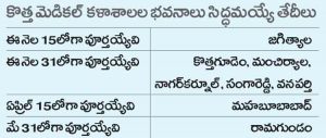 జగిత్యాల కాలేజీ భవనాన్ని ఈ నెల 15లోగా, కొత్తగూడెం, మంచిర్యాల, నాగర్కర్నూల్, సంగారెడ్డి, వనపర్తి కాలేజీల భవనాలను ఈ నెల 31లోగా మెడికల్ కాలేజీల యాజమాన్యానికి అప్పగించనున్నారు. మహబూబాబాద్ కాలేజీ భవనాన్ని ఏప్రిల్ 15, రామగుండం కాలేజీ భవనాన్ని మే 31న అందించేందుకు ఇంజనీరింగ్ అధికారులు కృషిచేస్తున్నారు.