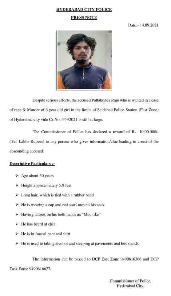 హైదరాబాద్ : నగరంలోని సైదాబాద్ సింగరేణి కాలనీలో బాలికపై లైంగికదాడి, హత్య కేసులో నిందితుడి కోసం పోలీసులు ముమ్మర గాలింపు చేపట్టారు. ఇప్పటి వరకు ఆచూకీ దొరక్క పోవడంతో మంగళవారం సంచలన నిర్ణయం తీసుకున్నారు. నిందితుడిని పట్టిస్తే రూ.10లక్షలు రివార్డు ఇవ్వనున్నట్లు ప్రకటించారు. నిందితుడి ఆచూకీ తెలిస్తే ఈస్ట్ జోన్ డీసీపీ 94906 16366, టాస్క్ ఫోర్స్ 94906 16627 నెంబర్లకు సమాచారం ఇవ్వాలని కోరారు. ఈ సందర్భంగా ఈ నేపథ్యంలో నిందితుడికి సంబంధించిన కొన్ని ఆనవాళ్లను తెలుపుతూ పోలీసులు రివార్డు ప్రకటించారు.