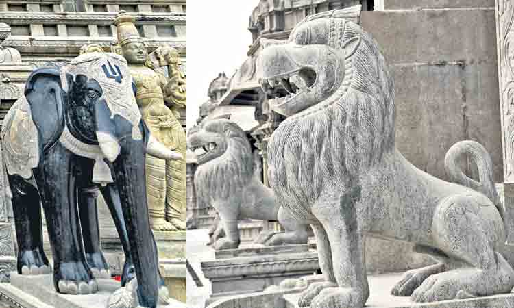 ఈ గోపుర ద్వారాలకు ముందు ఉభయ పార్శాలలో తూర్పు పడమర ద్వారాలకు ఏనుగులు, ఉత్తర దక్షిణ ద్వారాల ఉభయ పార్శాలలో సింహాలను అందంగా గండశిలలపై శిల్పీకరించి, వాటి అనుమతిలేక లోనికి ప్రవేశించరాదన్నట్లు గంభీరంగా ద్వారశోభను ద్విగుణీకృతం చేస్తున్నాయి. ఈ ఏనుగులు మహాబలిపురంలోని గజాకృతిలో ఉన్నాయి. ఇవి అక్కడే చేసి తెప్పించబడ్డాయి. వీటి పృష్ఠ భాగాలపై నగిషీలు, నునుపుదనం చేయడంవల్ల నల్లని ఏనుగులుగా దర్శనమిస్తున్నాయి. వీటి నిర్మాణానికి కృష్ణశిలలను వాడారు. మొత్తం సప్తద్వారాలు ఆలయావరణకు బహిరలంకారంగా నిలిచాయి. గర్భాలయంపై నిర్మించిన విమానగోపురం 45 అడుగుల ఎత్తులో అష్టభుజిగా నిర్మించబడింది. దీనికి స్వర్ణకవచం తొడుగుతున్నారు.