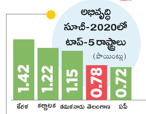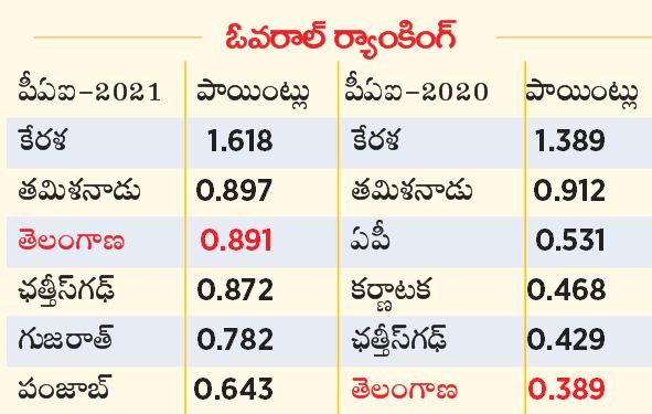 పీఏసీ గతేడాది విడుదలచేసిన ‘పీఏఐ-2020’లో తెలంగాణ నాలుగో స్థానంలో ఉన్నది. ఏడాదిలోనే అగ్రభాగానికి చేరడం విశేషం. ఈ ఏడాది కేరళ, కర్ణాటక, తమిళనాడును వెనక్కి నెట్టేసింది. గతేడాది ఏపీ 5వ స్థానంలో ఉండగా, ఈసారి 11వ స్థానానికి పడిపోయింది.