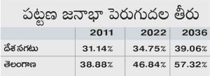 హైదరాబాద్, మార్చి 8 (నమస్తే తెలంగాణ): రాష్ట్రంలో పట్టణ జనాభా వేగంగా పెరుగుతున్నది. ఈ పెరుగుదల దేశ సగటు కంటే చాలా ఎక్కువగా ఉన్నది. ఈ ఏడాది ఆరంభం నాటికి తెలంగాణ జనాభాలో 1.79 కోట్ల (46.84 శాతం) మంది పట్టణాల్లో నివసిస్తున్నారు. దేశ సగటు (34.75 శాతం) కంటే ఇది దాదాపు 12% అధికం. 2036 నాటికి రాష్ట్రంలో పట్టణ జనాభా మరో 10.48 శాతం పెరిగి 2.20 కోట్లకు (57.32 శాతానికి) చేరుతుందని, ఇదే సమయంలో దేశ పట్టణ జనాభా 39.06 శాతంగా ఉంటుందని కేంద్ర వైద్య, కుటుంబ సంక్షేమశాఖ ఆధ్వర్యంలోని నేషనల్ కమిషన్ ఆన్ పాపులేషన్ అంచనా వేసింది. తద్వారా దేశ సగటు కంటే తెలంగాణ పట్టణ జనాభా దాదాపు 18 శాతం అధికంగా ఉంటుందని లెక్కగట్టింది.