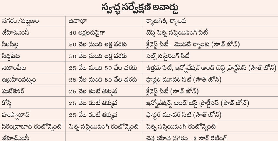 హైదరాబాద్, నవంబర్ 20 (నమస్తే తెలంగాణ): జాతీయస్థాయిలో అత్యుత్తమ నగరాలు, పట్టణాలకు ఇచ్చే స్వచ్ఛ సర్వేక్షణ్, పారిశుద్ధ్య అవార్డుల్లో తెలంగాణ సత్తా చాటింది. సఫాయి మిత్ర సురక్ష పథకంలో దేశంలో తెలంగాణ ఉత్తమ రాష్ట్రంగా రెండోస్థానంలో నిలిచింది. పరిశుభ్రమైన నగరాలుగా పలు నగరాలు, పట్టణాలు అవార్డులు దక్కించుకున్నాయి. గ్రేటర్ హైదరాబాద్ మున్సిపల్ కార్పొరేషన్ (జీహెచ్ఎంసీ) దేశంలోనే 40లక్షలపైన జనాభా ఉన్న నగరాల్లో ‘బెస్ట్ సెల్ఫ్ సస్టెయినింగ్ సిటీ’గా (స్వీయ సుస్థిరత సాధించటంలో) నిలిచింది. సిరిసిల్ల, ఘట్కేసర్ అత్యంత పరిశుభ్రమైన పట్టణాలుగా నిలిచాయి. శనివారం ఢిల్లీలో జరిగిన కార్యక్రమంలో రాష్ట్రపతి రామ్నాథ్ కోవింద్, కేంద్ర మంత్రి హర్దీప్సింగ్ పురి ఈ అవార్డులను అందించారు. రాష్ట్రం నుంచి పట్టణాభివృద్ధిశాఖ ప్రత్యేక ప్రధాన కార్యదర్శి అరవింద్ కుమార్, సీడీఎంఏ ఎన్ సత్యనారాయణ, కరీంనగర్ మేయర్ సునీల్రావు, ఇతర పట్టణ స్థానిక సంస్థల ప్రజాప్రతినిధులు అవార్డులను అందుకున్నారు. ఈ అవార్డులకు దేశంలోని 4,300 నగరాలు, పట్టణాలు పోటీ పడ్డాయి. సఫాయి మిత్ర సురక్ష చాలెంజ్లో రెండో బహుమతిని అందుకున్న కరీంనగర్ పట్టణానికి రూ.4 కోట్ల నగదును కేంద్ర ప్రభుత్వం అందించనున్నది. ‘పట్టణ ప్రగతి’లో చేపట్టిన కార్యక్రమాలు జాతీయస్థాయిలో అవార్డుల పంట పండించాయి. అవార్డులు అందుకున్న పట్టణ స్థానిక ప్రజాప్రతినిధులు, ఉన్నతాధికారులను మంత్రి కే తారకరామారావు అభినందించారు.