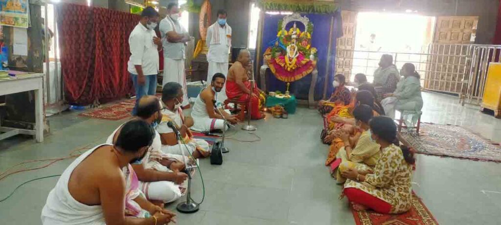 అమ్మవారికి దివ్యాభరణాలు, నూతన క్షోమ వస్ర్తాలను దరింపజేసి దివ్యా భరణ శోభితంగా ఆస్థానంలో వేంచేపు చేయడం జరిగింది. బ్రాహ్మణులందరికీ ఆహ్వానించి ఋత్వి కరణం, విశ్వక్సేనార ధనలు, పుణ్యాహవచనం, రక్షాబంధనంతో పాటు పారాయణాలు, జపాలు జరిపారు.