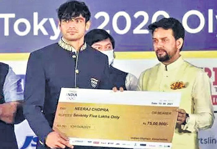 టోక్యో ఒలింపిక్స్ విజేతలకు ఇండియన్ ఒలింపిక్ అసోసియేషన్ (ఐవోఏ) ఆగస్టు 15న సన్మాన కార్యక్రమాన్ని నిర్వహించింది. కేంద్ర క్రీడల మంత్రి అనురాగ్ ఠాకూర్ వారిని సన్మానించారు. స్వర్ణం గెలిచిన నీరజ్ చోప్రాకు రూ.75 లక్షలు, రజతం నెగ్గిన మీరాబాయి, రవి దహియాలకు రూ.50 లక్షల చొప్పున, కాంస్యాలు సాధించిన పీవీ సింధు, లవీనా, బజరంగ్ పునియాలకు చూ.25 లక్షల చొప్పున అందించారు. ప్రభుత్వం చేపట్టిన ‘టార్గెట్ ఒలింపిక్ పోడియం స్కీం (టాప్స్)’ను విస్తృతపర్చనున్నట్లు మంత్రి తెలిపారు. 2024, 28 ఒలింపిక్స్ను దృష్టిలో పెట్టుకుని టాప్స్లో మరింత మంది అథ్లెట్లకు చోటు కల్పించనున్నారు.