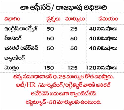 సిలబస్: బ్యాంకింగ్ కార్యకలాపాల్లో ‘లా’ అవశ్యకత, బ్యాంకింగ్ రెగ్యులేషన్స్, కైంప్లెంట్స్ అండ్ లీగల్ యాస్పెక్ట్స్, రిలవెంట్ లా అండ్ ఆర్డర్స్ రిలేటెడ్ టు నెగోషియబుల్ ఇన్స్ట్రుమెంట్, సెక్యూరిటీస్ అండ్ ఫారెన్ ఎక్సేంజ్, ప్రివెన్షన్ ఆఫ్ మనీలాండరింగ్ లిమిటెడ్ యాక్ట్, బ్యాంకింగ్ యాక్ట్స్, బ్యాంకింగ్ వినియోగదారుల హక్కు చట్టం వంటి అంశాలు ముఖ్యమైనవి.