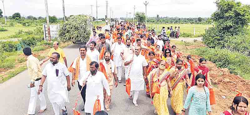కొత్తూరు రూరల్, ఆగస్టు 15 : పవన్గురు సేవాట్రస్ట్ ఆధ్వర్యంలో మార్వాడీ సంఘం నాయకులు, భక్తులు ఆదివారం మండలకేంద్రం నుంచి మండలపరిధిలోని పెంజర్ల గ్రామంలోని 9 టెంపుల్స్ దేవాలయం వరకు పాదయాత్ర(కావడియాత్ర) నిర్వహించారు. ప్రతి ఏడాది శ్రావణమాసంలో హరిద్వార్ నుంచి తీసుకువచ్చిన గంగాజలాన్ని కావడిలో మోసుకుని 9టెంపుల్స్లోని శివుడికి అభిషేకం చేస్తారు. అందులో భాగంగా గంగాజలాన్ని కావడిలో తీసుకువచ్చి శివుడికి అభిషేకం చేశారు. అనంతరం భక్తి శ్రద్ధలతో భజన కార్యక్రమాన్ని నిర్వహించారు. అనంతరం భక్తులకు అన్నదానం చేశారు. కార్యక్రమంలో ట్రస్ట్ సభ్యులు ముఖేశ్గోయల్, దినేశ్ అగర్వాల్, నీలేశ్ అగర్వాల్, దినేశ్ లావోటీ, రాజ్ అగర్వాల్, లీలాధర్ శర్మ, అరవింద్మిర్దా పాల్గొన్నారు.