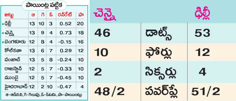 చెన్నై: గైక్వాడ్ (సి) అశ్విన్ (బి) నోర్జే 13, డుప్లెసిస్ (సి) శ్రేయస్ (బి) అక్షర్ 10, ఉతప్ప (సి అండ్ బి) అశ్విన్ 19, అలీ (సి) శ్రేయస్ (బి) అక్షర్ 5, రాయుడు (నాటౌట్) 55, ధోనీ (సి) పంత్ (బి) అవేశ్ 18, జడేజా (నాటౌట్) 1, ఎక్స్ట్రాలు: 15, మొత్తం: 136/5. వికెట్ల పతనం: 1-28, 2-39, 3-59, 4-62, 5-132, బౌలింగ్: నోర్జే 4-0-37-1, అవేశ్ 4-0-35-1, అక్షర్ 4-0-18-2, రబడ 4-0-21-0, అశ్విన్ 4-0-20-1.