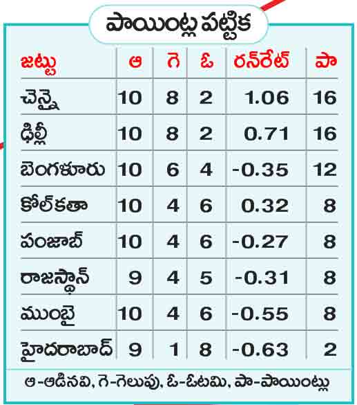 ఆల్రౌండ్ ప్రదర్శనతో సత్తాచాటిన చెన్నై సూపర్ కింగ్స్ పాయింట్ల పట్టికలో తిరిగి అగ్రస్థానానికి చేరింది. బౌలర్ల క్రమశిక్షణకు.. బ్యాటర్ల మెరుపులు తోడవడంతో ఉత్కంఠ పోరులో పైచేయి సాధించిన ధోనీ సేన.. ఎనిమిదో విజయంతో ప్లే ఆఫ్స్కు చేరువైంది. ధాటిగా ఆడుతున్న కోల్కతా ఆటగాళ్ల ముందరి కాళ్లకు శార్దూల్ ఠాకూర్ బంధం వేస్తే.. తీవ్ర ఒత్తిడి మధ్య క్రీజులో అడుగుపెట్టిన ఆల్రౌండర్ రవింద్ర జడేజా మెరుపులు మెరిపించాడు.