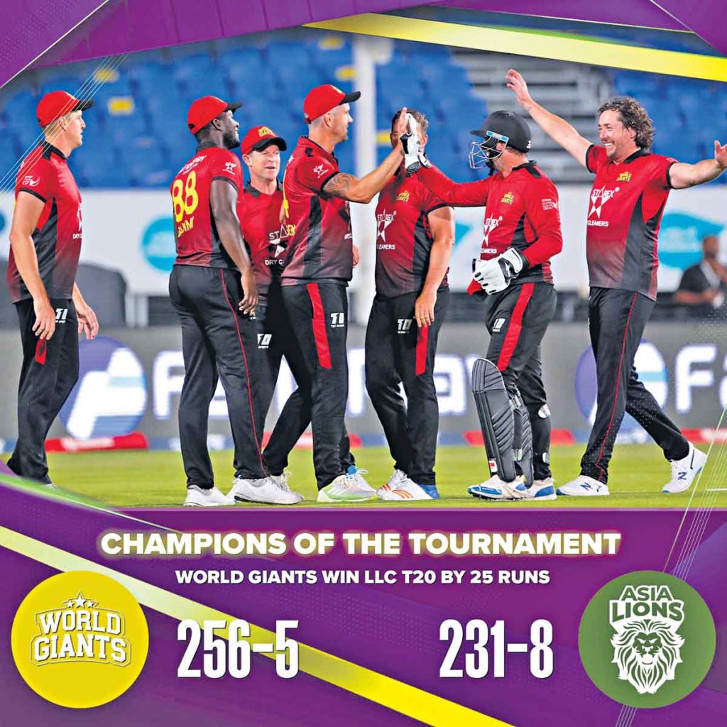 లెజెండ్స్ లీగ్ క్రికెట్లో వరల్డ్ జెయింట్స్ జట్టు విజేతగా నిలిచింది. శనివారం జరిగిన ఫైనల్లో వరల్డ్ జెయింట్స్ 25 పరుగుల తేడాతో ఆసియా లయన్స్పై విజయం సాధించింది.