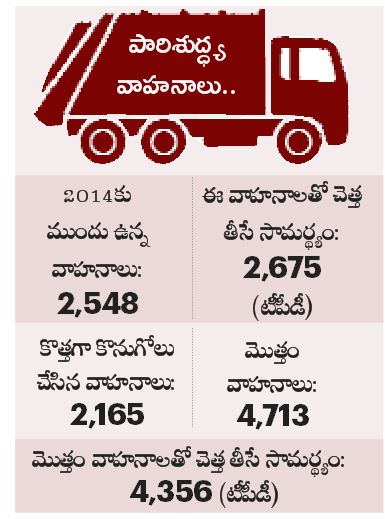 ప్రతి ఇంటి నుంచి చెత్త సేకరణ విధానాన్ని ప్రభుత్వం పటిష్టంగా అమలు చేస్తున్నది. ఇందుకోసం 141 పట్టణాల్లో 2,165 కొత్త వాహనాలను కొనుగోలు చేసింది. దీంతో ప్రతిరోజు 4,356 టన్నుల చెత్తను సేకరించే సామర్థ్యం ఇప్పుడు కలిగింది. ప్రజలకు 37.19లక్షల చెత్త బుట్టలను ప్రభుత్వం పంపిణీ చేసింది.