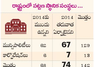 మున్సిపాలిటీల అభివృద్ధికి ఊతమిచ్చేలా ప్రభుత్వం కొత్త మున్సిపల్ చట్టాన్ని తీసుకువచ్చింది. పెద్ద గ్రామాలు, నగర పంచాయతీలను మున్సిపాలిటీలుగా మార్చింది. ఒకేసారి 74 కొత్త మున్సిపాలిటీలు, నగర పాలక సంస్థలను ఏర్పాటు చేసింది.