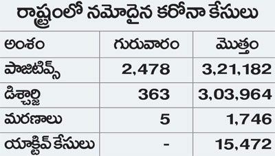 హైదరాబాద్, ఏప్రిల్ 9 (నమస్తే తెలంగాణ): కరోనా నిర్ధారణ పరీక్షల సంఖ్యను ప్రభుత్వం రెండింతలు చేసింది. గురువారం ఒక్కరోజే లక్షకుపైగా నమూనాలను పరీక్షించారు. 1,01,986 పరీక్షలు చేయగా, 2,478 మందికి వైరస్ నిర్ధారణ అయ్యిందని శుక్రవారం బులెటిన్లో వైద్యారోగ్యశాఖ పేర్కొన్నది. జీహెచ్ఎంసీలో 402 కేసులు, మేడ్చల్ మల్కాజిగిరి జిల్లాలో 208, నిజామాబాద్లో 176, రంగారెడ్డిలో 162, నిర్మల్లో 111, జగిత్యాలలో 105, మహబూబ్నగర్లో 96, కమారెడ్డిలో 98, నల్లగొండలో 88, కరీంనగర్లో 87, మంచిర్యాలలో 85, వరంగల్ అర్బన్లో 82, సంగారెడ్డిలో 79, ఆదిలాబాద్లో 72, కుమ్రంభీం ఆసిఫాబాద్లో 67 కేసులు నమోదయ్యాయి. కరోనాకు తోడు ఇతర దీర్ఘకాలిక వ్యాధుల కారణంగా ఐదుగురు మృతిచెందారు. ప్రస్తుతం 15,472 మంది దవాఖానలు, హోంఐసొలేషన్లలో చికిత్స పొందుతున్నారు. ఆంధ్రప్రదేశ్లో గురువారం 31,892 నిర్ధారణ పరీక్షలు చేయగా, 2,765 మందికి పాజిటివ్గా తేలింది. అత్యధికంగా చిత్తూరు జిల్లాలో 496 కేసులు నమోదయ్యాయి. 11 మంది ప్రాణాలు కోల్పోయారు.