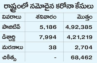 హైదరాబాద్, మే 8 (నమస్తే తెలంగాణ): రాష్ట్రంలో శనివారం రికార్డుస్థాయిలో డిశ్చార్జిలు నమోదయ్యాయి. ఒక్కరోజే 7,994 మంది కోలుకున్నట్టు వైద్యారోగ్యశాఖ విడుదలచేసిన బులిటెన్లో తెలిపింది. మొత్తం డిశ్చార్జిల సంఖ్య 4.20 లక్షలు దాటింది. రికవరీరేటు 85.54 శాతానికి పెరుగగా.. జాతీయ సగటు 81.9 శాతంగా ఉన్నది. కొత్తగా 5,186 మందికి పాజిటివ్గా తే లింది. అత్యధికంగా జీహెచ్ఎంసీ పరిధిలో 904, రంగారెడ్డిలో 339, మేడ్చల్ మల్కాజిగిరిలో 366, నల్లగొండలో 317, వరంగల్ అర్బన్లో 231, కరీంనగర్లో 182 కేసులు వెలుగుచూశాయి. కరోనా, ఇతర కారణాల వల్ల 38 మంది మరణించారు. యాక్టివ్ కేసుల సంఖ్య 68 వేలకు తగ్గింది. మధ్యాహ్నానికి రాష్ట్రవ్యాప్తంగా 25,367 పడకలు అందుబాటులో ఉన్నట్టు వైద్యారోగ్యశాఖ తెలిపింది. ఇందులో 7,420 పడకలు ప్రభుత్వదవాఖానల్లో, 17,947 ప్రైవే ట్దవాఖానల్లో అందుబాటులో ఉన్నాయి.