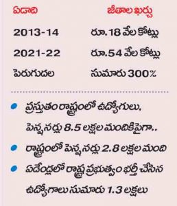 హైదరాబాద్, మార్చి 9 : కొత్త ఉద్యోగాల భర్తీతో రాష్ట్ర ప్రభుత్వంపై ఏటా రూ.7 వేల కోట్ల వరకు అదనంగా భారం పడనున్నది. రాష్ట్రంలో ఉద్యోగులకు చెల్లిస్తున్న వేతనాల ఖర్చు ఏడేండ్లలోనే మూడు రెట్లు పెరిగింది. 2013-14లో తెలంగాణ ప్రాంత ఉద్యోగుల వేతనాలు, పెన్షన్లు కలిపి దాదాపు రూ.18 వేల కోట్లు వెచ్చించారు. తెలంగాణ ఏర్పాటైన వెంటనే సీఎం కేసీఆర్ ఉద్యోగులందరికీ ప్రత్యేక ఇంక్రిమెంట్ ఇచ్చారు. ఆ తర్వాత 43 శాతం పీఆర్సీని ప్రకటించారు. సీపీఎస్ ఉద్యోగులకు అదనపు డెత్ అండ్ రిటైర్మెంట్ బెనిఫిట్స్ కల్పించారు. ప్రత్యేకంగా ఆరోగ్య పథకాన్ని రూపొందించి, అమలు చేస్తున్నారు. ఇందుకు రూ.500 కోట్లు వెచ్చిస్తున్నారు. ఆ తర్వాత అంగన్వాడీలు, వీఆర్ఏలు, వీవోఏలు, జలమండలి ఉద్యోగులు ఇలా ఒక్కో వర్గం ఉద్యోగులకు పరిస్థితులకు అనుగుణంగా వేతనాలు పెంచారు. గతేడాది ప్రభుత్వం రెగ్యులర్ ఉద్యోగులతోపాటు మిగతావారికీ 30 శాతం పీఆర్సీ ప్రకటించి అమలు చేస్తున్నది. దీంతో వేతన బడ్జెట్ రూ.54 వేల కోట్లకు చేరింది. అంటే.. ఏడేండ్లలోనే వేతన బడ్జెట్ సుమారు మూడు రెట్లు పెరిగింది. పెన్షన్ల కోసమే రాష్ట్ర ప్రభుత్వం ఏటా రూ.11 వేల కోట్లకుపైగా ఖర్చు చేస్తున్నది. కొత్త ఉద్యోగాల భర్తీతో వేతన బడ్జెట్ రూ.58-60 వేల కోట్లకు చేరే అవకాశం ఉన్నదని నిపుణులు చెప్తున్నారు.
