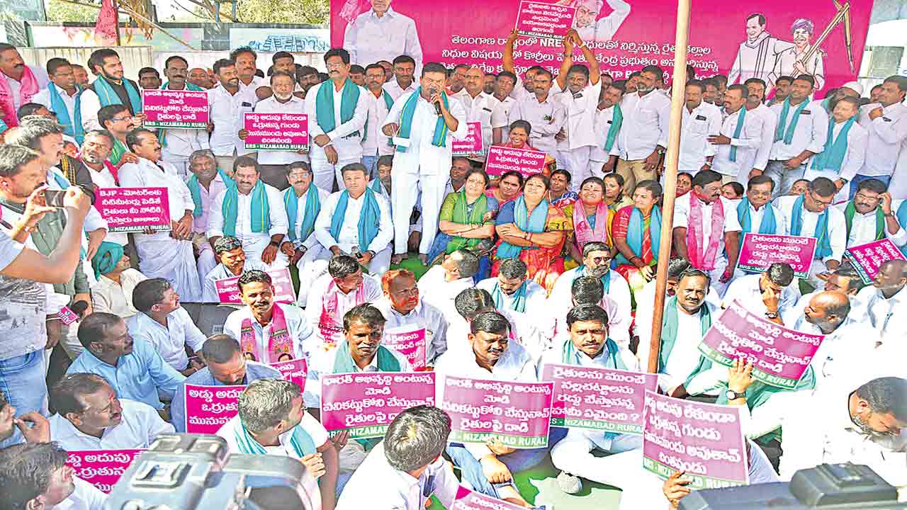 సంగారెడ్డిలోని ఆర్డీవో కార్యాలయం ఎదుట నిర్వహించిన ధర్నాలో బీఆర్ఎస్ జిల్లా అధ్యక్షుడు చింతా ప్రభాకర్, ఎమ్మెల్యేలు మహిపాల్రెడ్డి, చంటి క్రాంతికిరణ్, మాణిక్రావు, భూపాల్రెడ్డి పాల్గొన్నారు. మెదక్లో జిల్లా పార్టీ అధ్యక్షురాలు, ఎమ్మెల్యే పద్మాదేవేందర్రెడ్డి, ఎమ్మెల్సీ శేరి సుభాశ్రెడ్డి, ఎమ్మెల్యే మదన్రెడ్డి, సిద్దిపేటలో ఎంపీ కొత్త ప్రభాకర్రెడ్డి, ఎమ్మెల్సీలు ఫారూఖ్ హుస్సేన్, యాదవరెడ్డి తదితరులు పాల్గొన్నారు. నిజామాబాద్ మహాధర్నాలో ఎమ్మెల్యేలు ఆశన్నగారి జీవన్రెడ్డి, బిగాల గణేశ్గుప్తా, ఎమ్మెల్సీ వీజీగౌడ్, కామారెడ్డి ధర్నాలో ప్రభుత్వ విప్ గంప గోవర్ధన్, ఎమ్మెల్యే హన్మంత్ షిండే పాల్గొన్నారు. ఖమ్మం, భద్రాద్రి కొత్తగూడెం జిల్లా కేంద్రాల్లో ఆయా జిల్లాల పార్టీ అధ్యక్షులు తాతా మధుసూదన్, రేగా కాంతారావు, ఎమ్మెల్యేలు సండ్ర వెంకటవీరయ్య, వనమా వెంకటేశ్వరరావు, రాములునాయక్, హరిప్రియానాయక్, మెచ్చా నాగేశ్వరరావు పాల్గొన్నారు.
