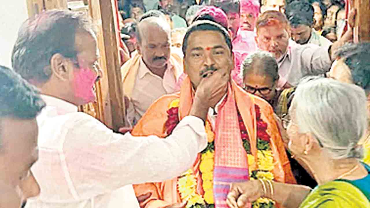 మహబూబ్నగర్ జిల్లాలోని భూత్పూర్ మండలంలోని అన్నాసాగర్లో బీఆర్ఎస్ బలపర్చిన అభ్యర్థి ఆల శ్రీకాంత్రెడ్డి గెలుపుతో మాజీ ఎమ్మెల్యే ఆల వెంకటేశ్వర్రెడ్డికి స్వీట్లు తినిపిస్తున్న నాయకులు