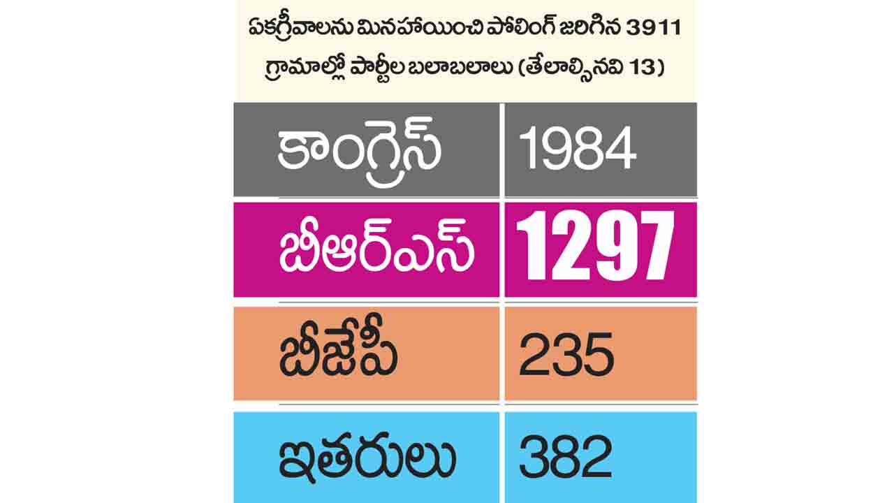 అధికారపక్షానికి ముచ్చెమటలు పట్టించింది. రెండో విడత పంచాయతీ ఎన్నికలకు సంబంధించి 31 జిల్లాలు, 193 మండలాల్లోని 4,333 గ్రామాల్లో ఎన్నికలకు అధికారులు నోటిఫికేషన్ ఇచ్చారు. ఇందులో ఐదు గ్రామాల్లో వివిధ కారణాలతో నామినేషన్లు దాఖలు కాలేదు. మరో 415 జీపీలు ఏకగ్రీవమయ్యాయి. మరో రెండుచోట్ల ఎన్నికలు నిలిచిపోయాయి. మిగిలిన 3,911 జీపీలకు ఆదివారం పోలింగ్ నిర్వహించగా, 12,782 మంది అభ్యర్థులు బరి లో నిలిచారు. ఇందులో ఏకగ్రీవమైన స్థానా లు మినహాయించి అధికారపక్షమైన కాంగ్రెస్ బలపరిచిన అభ్యర్థులు 1,982 స్థానాలు మా త్రమే గెలిచారు. బీఆర్ఎస్ బలపరిచిన అభ్యర్థులు 1,297 స్థానాల్లో విజయకేతనం ఎగరవేశారు. ఇతరులు దాదాపు 381 స్థానాల్లో గెలుపొందగా, అందులోనూ 95 శాతానికిపైగా అభ్యర్థులు గులాబీ నేతలే కావడం గమనార్హం. వెరసి అధికార, ప్రతిపక్ష పార్టీల మధ్య సంఖ్యాబలం అత్యంత స్వల్పంగానే ఉన్నది. దీంతోనే కాంగ్రెస్పై గ్రామీణ ఓటర్లలో ఎంత వ్యతిరేకత ఉన్నదో స్పష్టంగా తేలిపోయింది.