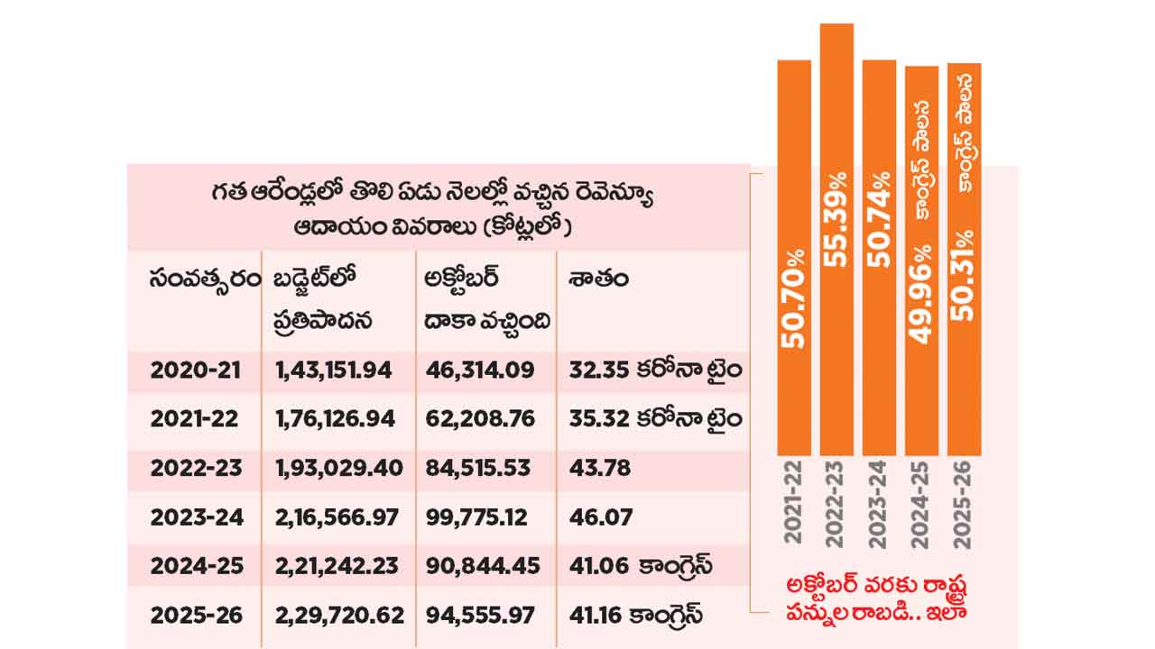 ప్రస్తుత (2025-26) ఆర్థిక సంవత్సరంలో రెవెన్యూ ఆదాయం రూ.2,29,720.62 కోట్లు వస్తుందని అంచనా వేయగా, అక్టోబర్ నాటికి రూ.94,555.97 కోట్లు అంటే 41.16 శాతమే వచ్చింది. అదే కేసీఆర్ పాలనలో 2023-24 ఆర్థిక సంవత్సరంలో రెవెన్యూ ఆదాయం రూ. 2,16,566.97 కోట్లు వస్తుందని ప్రతిపాదించగా, అక్టోబర్నాటికి రూ.99,775.12 కోట్లు అంటే 46.07 శాతం వచ్చింది. రాష్ర్టానికి వచ్చే మొత్తం ఆదాయం కూడా 2023-24లో అక్టోబర్ నాటికి 51.25 శాతం ఉంటే, ఇదే కాలానికి 2024-25లో 45.97 శాతం, 2025-26లో 50.95 మాత్రమే సమకూరింది. రాష్ట్రంలో కాంగ్రెస్ అధికారంలోకి వచ్చి రెండేండ్లయినా, సొంత ఆదాయ వనరులను పెంచుకోవడంలో విఫలమైంది. హైడ్రా, ఫ్యూచర్ సిటీ, మెట్రో రద్దు వంటి నిర్ణయాలతో రియల్ ఎస్టేట్ వ్యాపారం తగ్గిపోవడంతోపాటు రాష్ట్ర సొంత ఆదాయాలు తగ్గిపోయాయి. కేసీఆర్ పదేండ్ల పాలనలో సొంత ఆదాయ రాబడిలో ముందువరుసలో ఉన్న తె లంగాణ.. కాంగ్రెస్ పాలనలో దిగజారిపోతున్నది.