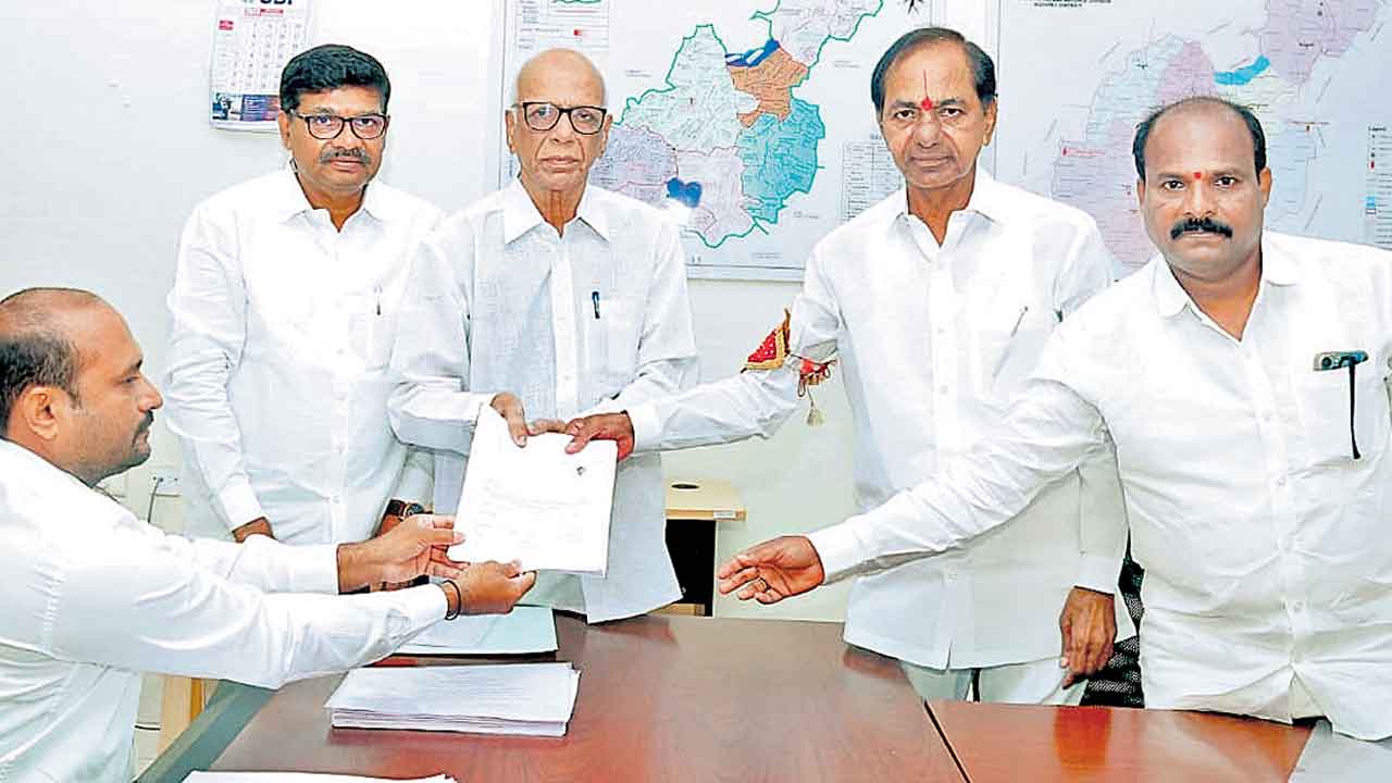 సిద్దిపేట, నవంబర్ 9 (నమస్తే తెలంగాణ ప్రతినిధి): బీఆర్ఎస్ అధ్యక్షుడు, ముఖ్యమంత్రి కే చంద్రశేఖర్రావు గజ్వేల్, కామారెడ్డి నియోజకవర్గాల నుంచి నామినేషన్లు దాఖలు చేశారు. ఎర్రవల్లిలోని వ్యవసాయక్షేత్రం నుంచి సీఎం కేసీఆర్ హెలికాప్టర్లో గురువారం ఉదయం సిద్దిపేట జిల్లా గజ్వేల్ ఐవోసీ కార్యాలయం వెనుక ఏర్పాటుచేసిన హెలిప్యాడ్ వద్ద 11 గంటలకు చేరుకున్నారు. ఆయనకు స్థానిక ప్రజాప్రతినిధులు ఘనంగా స్వాగతం పలికారు. సీఎం కేసీఆర్ ప్రత్యేక వాహనంలో ఆర్వో కార్యాలయానికి చేరుకొనే క్రమంలో బీఆర్ఎస్ నాయకులు గులాబీపూలు చల్లి అభిమానాన్ని చాటుకున్నారు.