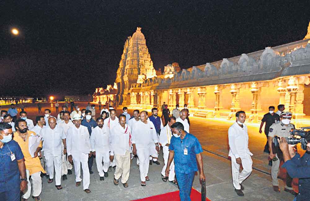 హైదరాబాద్, అక్టోబర్ 19 (నమస్తే తెలంగాణ): యాదాద్రి దివ్యక్షేత్రం పునఃప్రారంభ తేదీని ముఖ్యమంత్రి కే చంద్రశేఖర్రావు ప్రకటించారు. చిన్నజీయర్ స్వామి ఆధ్వర్యంలో విద్వత్ సభ, సిద్ధాంతుల సభ నిర్ణయించిన ముహూర్తం ప్రకారం వచ్చే ఏడాది మార్చి 28వ తేదీన మహాకుంభ సంప్రోక్షణ కార్యక్రమం నిర్వహించనున్నట్లు వెల్లడించారు. మార్చి 21న అంకురార్పణతో ఎనిమిది రోజులపాటు మహా సుదర్శన యాగం నిర్వహించనున్నట్టు చెప్పారు. మంగళవారం యాదాద్రిలో పర్యటించిన సీఎం కేసీఆర్ ఆలయ నిర్మాణ పనులను పరిశీలించిన అనంతరం ఆలయ పున:ప్రారంభ తేదీలను ప్రకటించారు. గర్భగుడిని పరిశీలించిన తర్వాత చినజీయర్ స్వామి స్వదస్తూరీతో రాసిన ముహూర్త పత్రాన్ని స్వామివారి పాదాల చెంత ఉంచాలని ఆలయ ఈవో గీతకు ముఖ్యమంత్రి అందించారు. అనంతరం మీడియా సమావేశంలో మాట్లాడారు. ముఖ్యాంశాలు ఆయన మాటల్లోనే..
