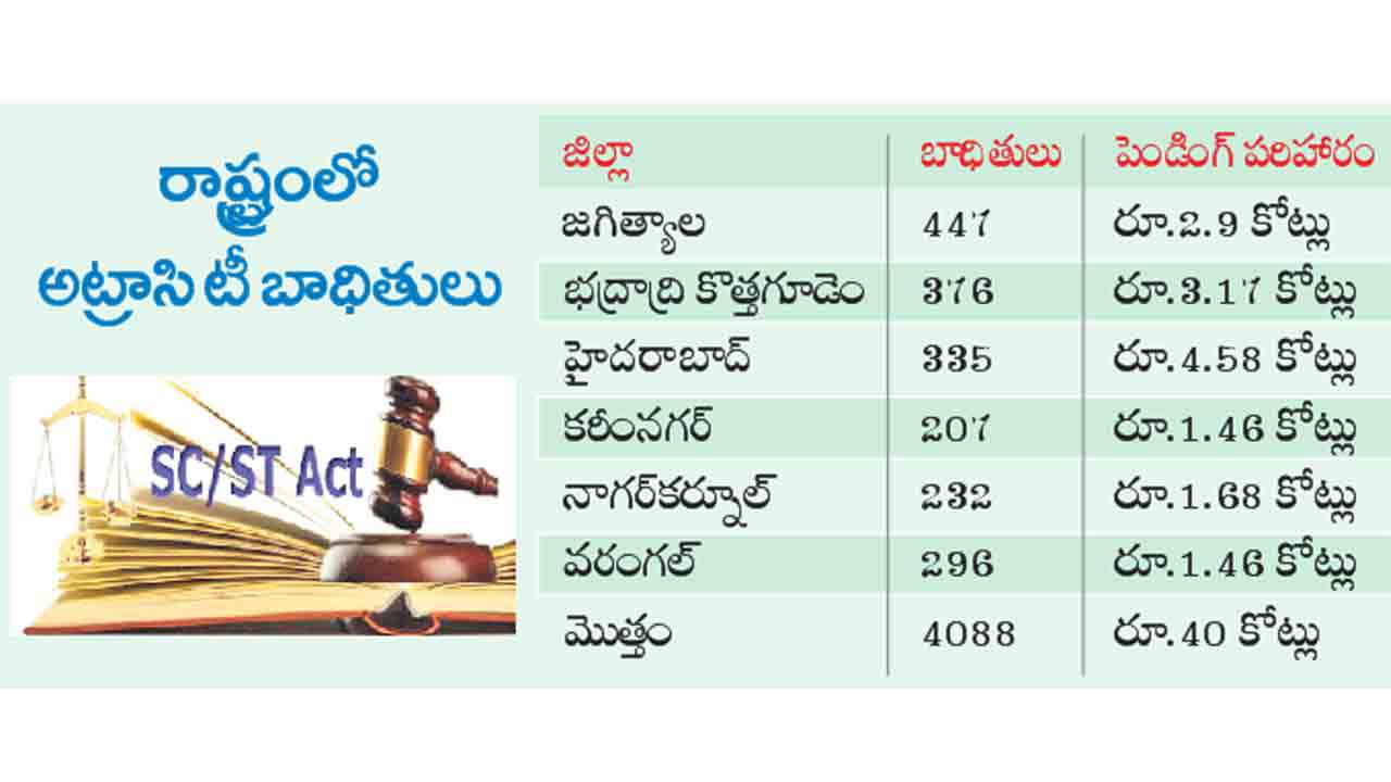 అట్రాసిటీ కేసులలో బాధితులకు పరిహారం చెల్లించకుండా ప్రభుత్వ పెద్దలు పూటకోమాట చెప్తున్నారు. నిరుడు ఆర్థిక సంవత్సరం ముగియడానికి ఒక రోజు ముందు రూ.14.38 కోట్లను విడుదల చేస్తూ ప్రభుత్వం ఉత్తర్వులిచ్చింది. కానీ ఆ నిధులు ఇప్పటికీ అందలేదంటే పరిస్థితి అర్థం చేసుకోవచ్చు. ఇప్పుడు కేంద్రం విడుదల చేయాల్సిన 50 శాతం నిధులు పెండింగ్లో ఉన్నాయని అధికారులు చేతులెత్తేస్తున్నారు. ఇప్పటికైనా రేవంత్ సర్కార్ పరిహారం చెల్లించాలని బాధితులు డిమాండ్ చేస్తున్నారు.